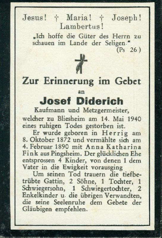 Kaufmann uns Metzgermeister; ∞ 4.2.1890 Anna Katharina Fink aus Pingsheim; 4 K. davona 1 † |