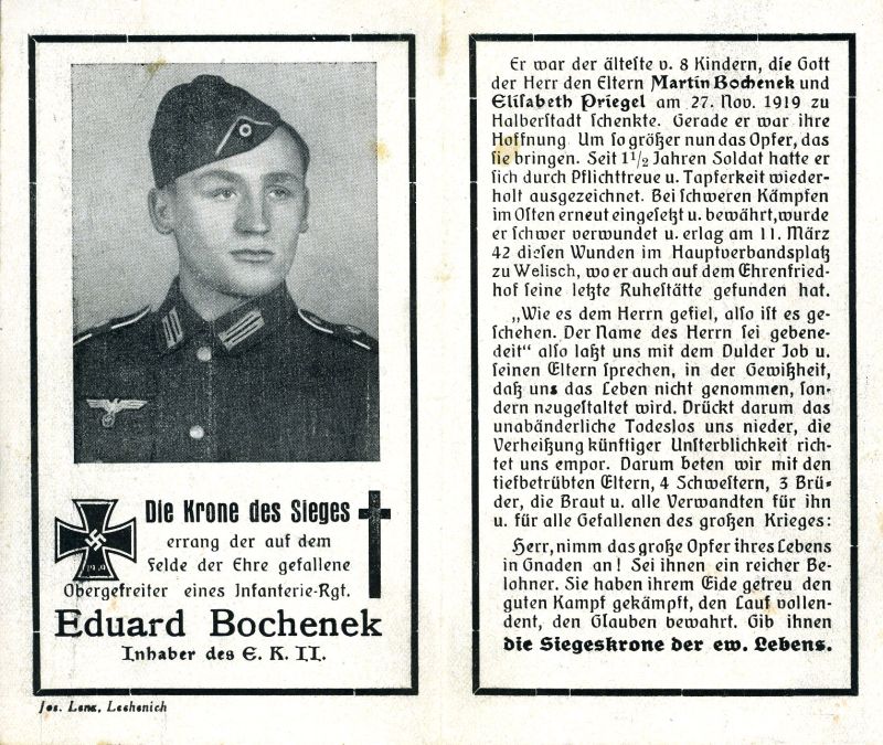 Eltern: Martin Bochenek und Elisabeth Priegel; Gefallener 2. Weltkrieg, aus Bliesheim |