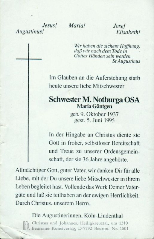 Sr. M. Nothburga OSA, geb. Gäntgen