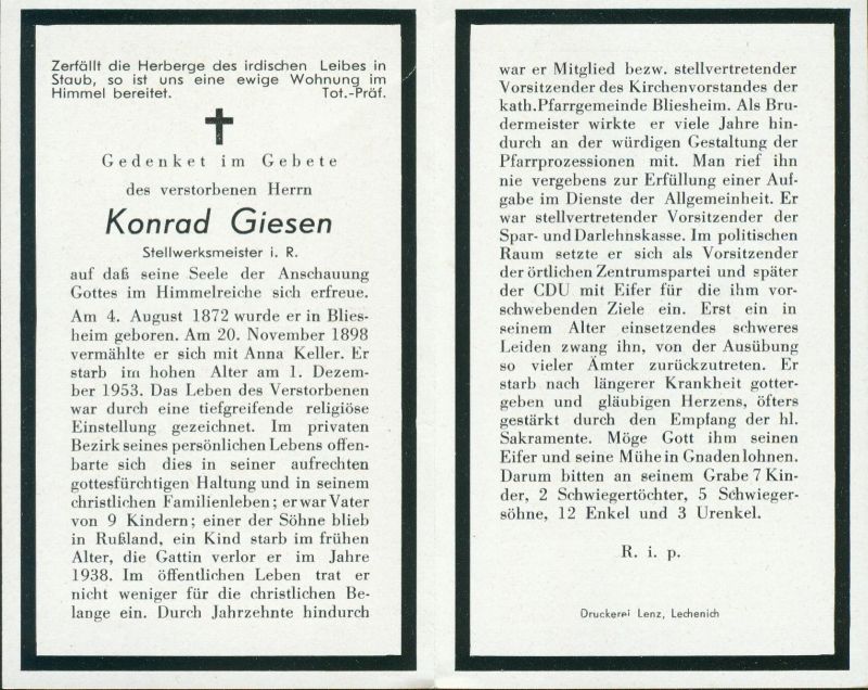 Stellwerksmeister; ∞ 20.11.1898 Anna Keller † 1938, 9 K. davon 2 †; stellv. Vors. Kirchenvorst., stellv. Vors. Spar- u. Darlehnsk., Vors. Zentrum bzw. CDU |