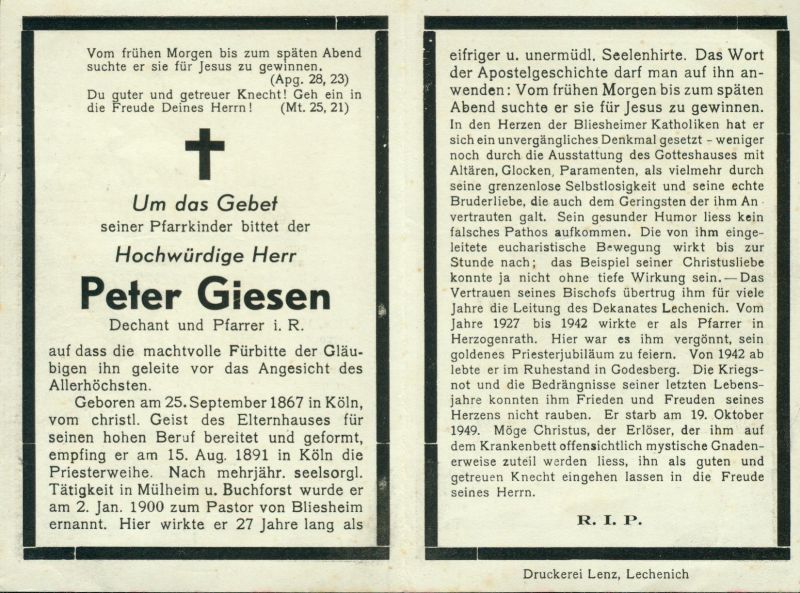 Dechant und Pfarrer; Priesterweihe 15.8.1891; Vikar Mühlheim u. Buchforst; 1900 bis 1927 Pastor in Bliesheim; 1927 bis 1942 Pfarrer in Herzogenrath |