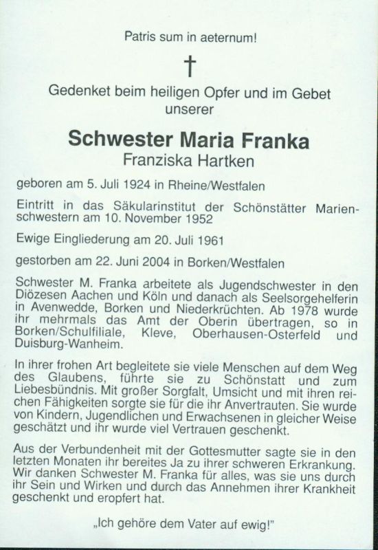 Jugendschwqester, Seelsorgehelferin, Oberin;10.11.1952 Eintritt Schönstätter Marienschwestern; 20.7.1961 ewige Eingliederung |