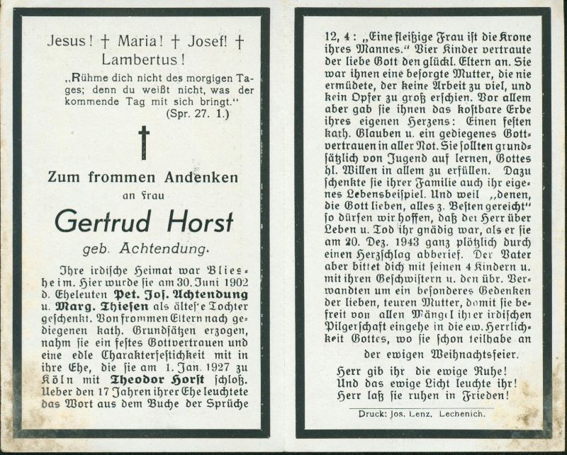 Eltern: Peter Josef Achtendung und Margarate Thiesen; ∞ 1.1.1927 Theodor Horst; 4 K. |
