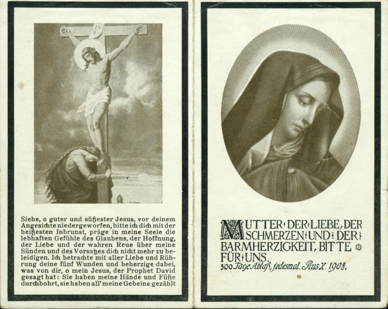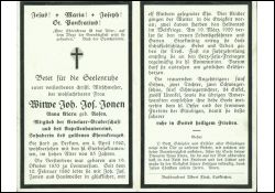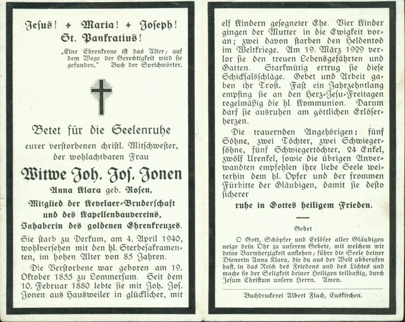 ∞ 10.2.1880 Johann Josef Jonen aus Hausweiler † 19.3.1929; 11 K. davon 4 †; Mitgl. D. Kevelaer-Bruderschaft u. i. Kapellenbauverein, Inh. d. goldenen Ehrenkreuzes |