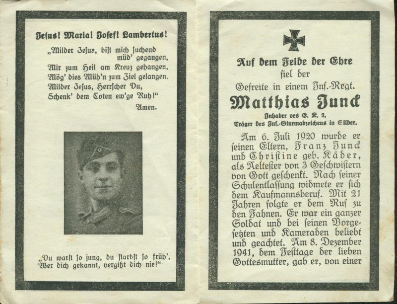Kaufm. Angestellter; Eltern: Franz Junck und Christine Käder; Gefallener 2. Weltkrieg |