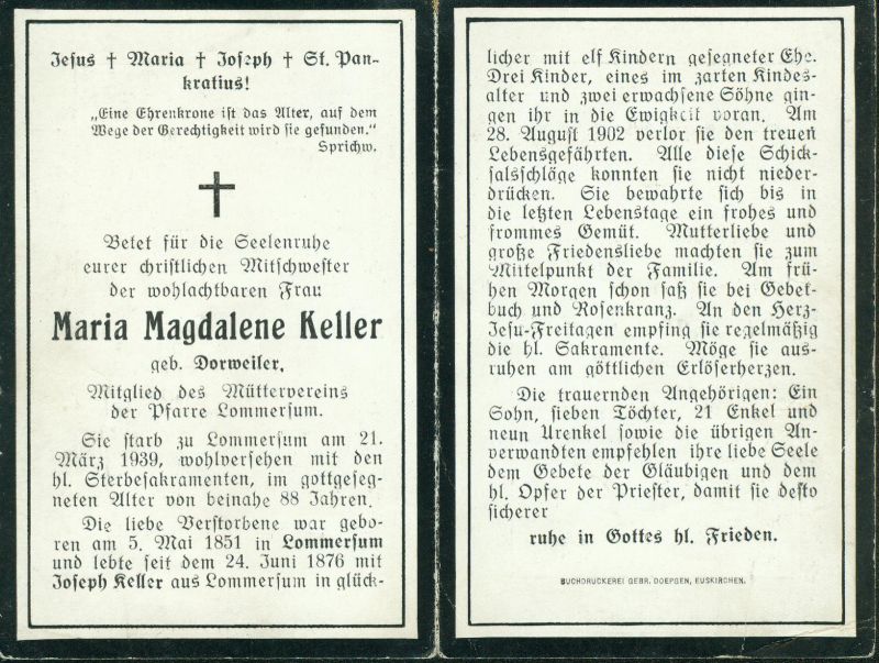 ∞ 24.6.1876 Josef Keller aus Lommersum † 28.8.1902 ; 11 K. davon 3 †; Mitgl. Mütterverein |