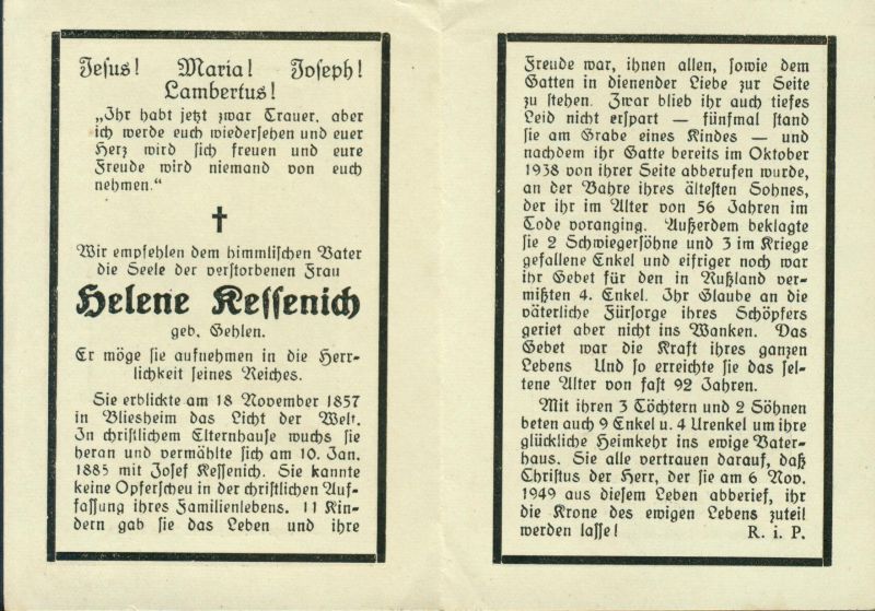 ∞ 10.1.1885 Josef Kessenich † Okt. 1938; 11 K. davon 6 † |
