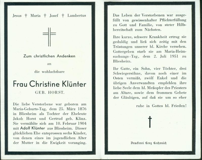 Eltern: Jakob Horst und Gertrud Klinz; ∞ 10.2.1904 Adolf Klünter; 6 K. davon 1 † |