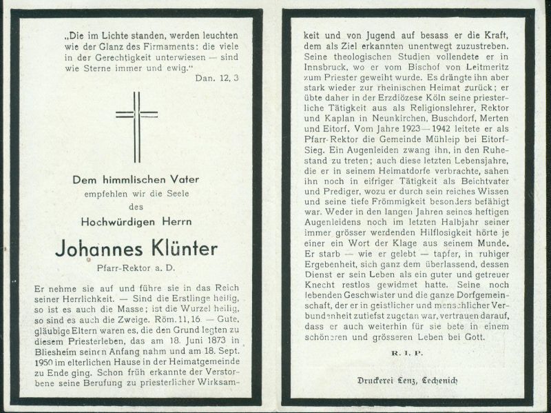 Pfarr-Rektor; Priesterweihe in Insbruck; Rligionslehrer, Rektor u. Kaplan in Neunkirchen, Buschdorf, Merten, Eitorf |