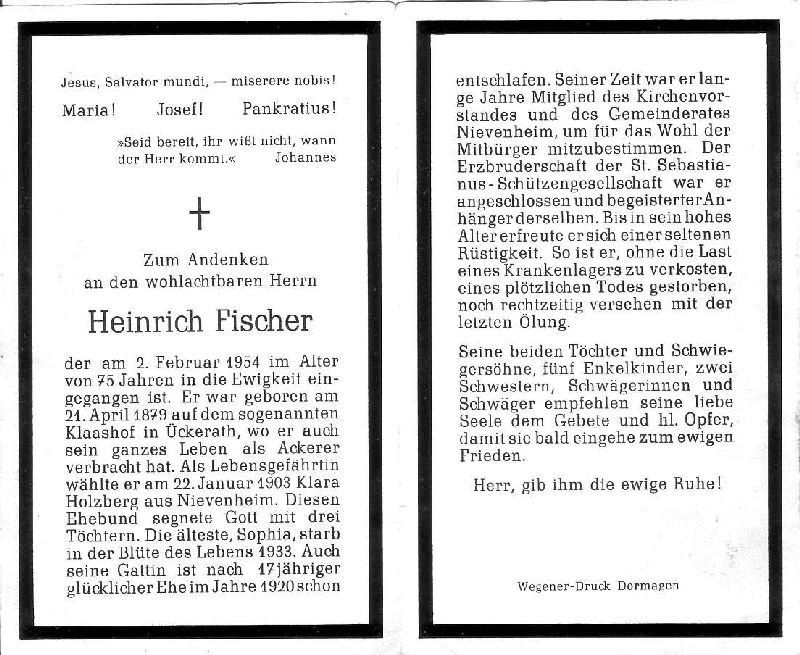 Ackerer; ∞ 22.1.1903 Klara Holzberg aus Nievenheim, † 1920; 3 Töchter; ältesre Tochter Sophia † 1933; Mitgl. Kirchenvorstand u. Gemeinderat Nievenheim; Mitgl. St. Sebastianus-Schützenbruderschaft |