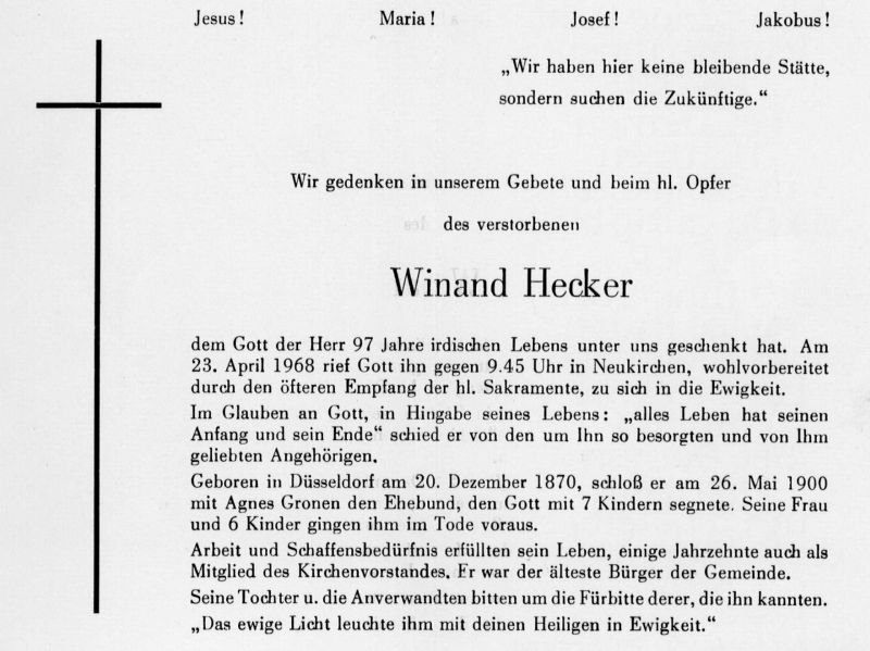 | ∞ 26.5.1900 Agnes Gronen, † ; 7 K., davon 6 †; einige Jahrzehnte lang Mitgl. d. Kirchenvorstandes |