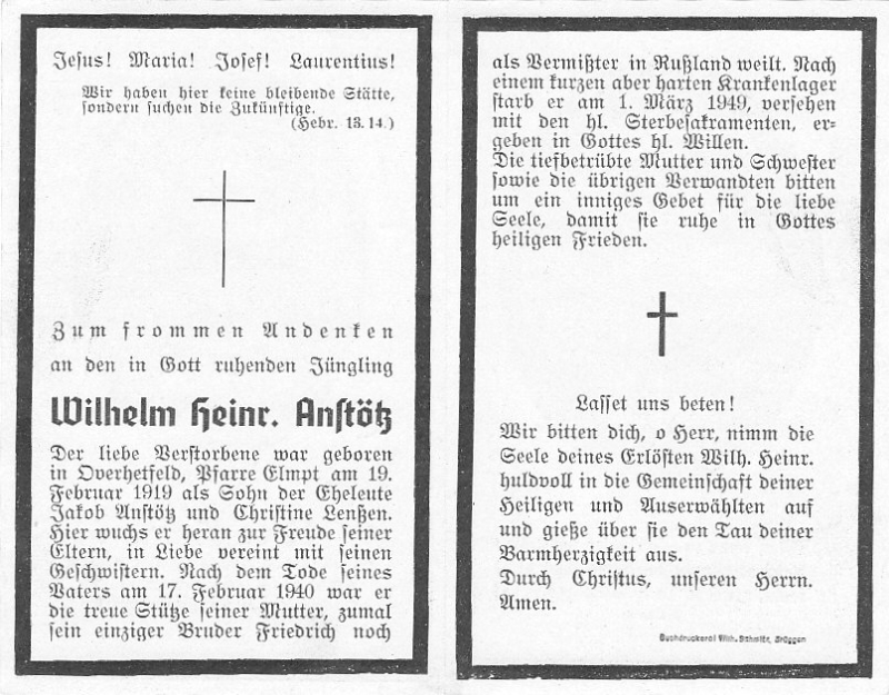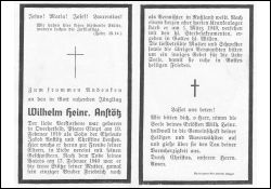 Jüngling; Eltern: Jakob Anstötz u. Christine geb. Lenßen; nach Tod des Vaters am 17.2.1940 war er die Stütze seiner Mutter; Bruder Friedrich im 2. Weltkrieg in Russland vermisst |