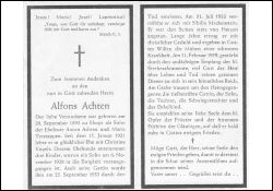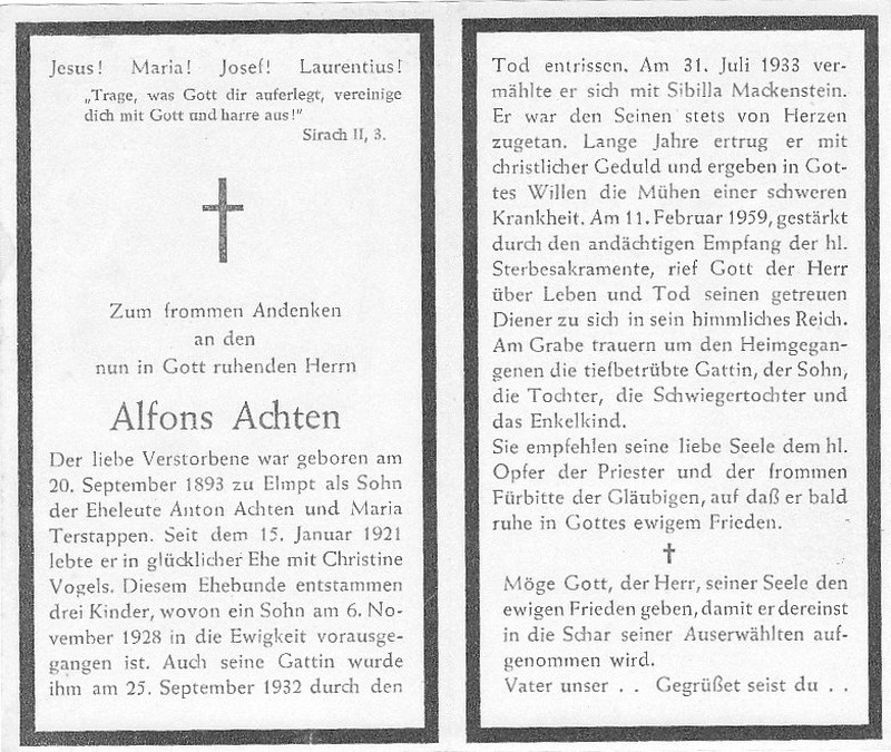 Eltern: Anton Achten u. Maria geb. Terstappen; ∞ 15.1.1921 Christine Vogel, † 25.9.1932s; 3 K., davon 1 Sohn am 6.11.1928 †; ∞ 31.7.1933 Sibilla Mackenstein; lange Jahre schwere Krankheit |