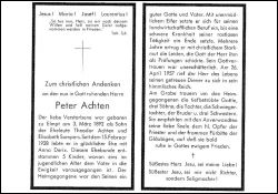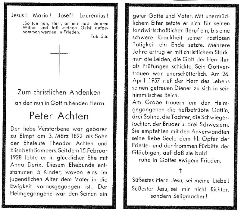 Eltern: Theodor Achten u. Alisabeth geb. Sampers; ∞ 15.2.1928 Anna Derix; 5 K., davon 1q in jugendl. Alter †; landwirtschaftl. Beruf; mehrere Jahre leidend |