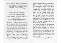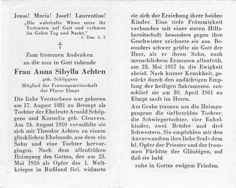Mitgl. Frauengemeinschaft Elmpt; Eltern: Arnold Schöpgens u. Kornelia geb. Cleuvers; ∞ 24.8.1910 Theodor Achten, am 23.15.1916 im 1. Weltkrieg in Russland gefallen; 2 K.;, davon 1 Sohn am 23.6.1957 †; |