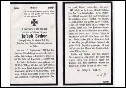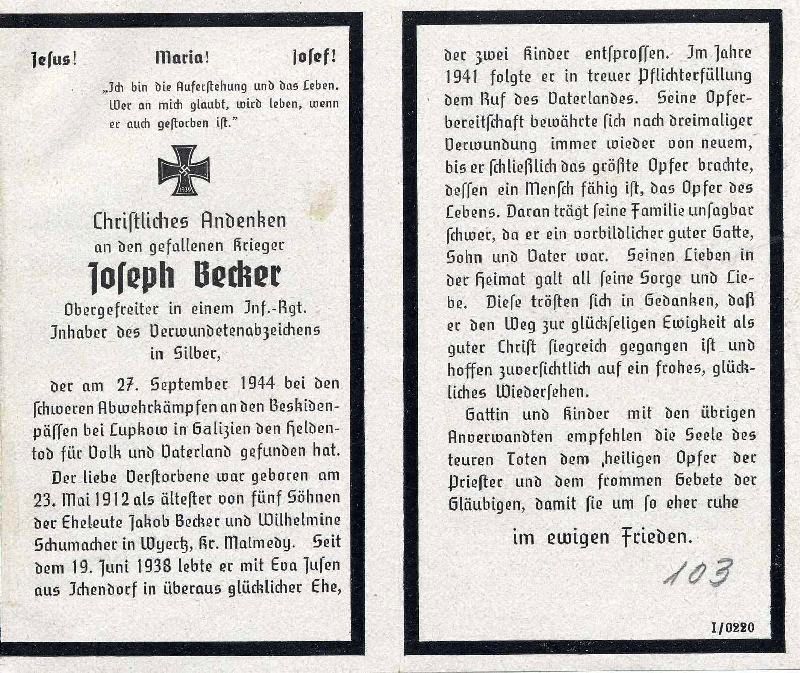 Gefallener 2. Weltkrieg; Eltern: Becker Jakob und Schumacher Wilhelmine; Brüder: 4; Ehefrau: Jusen Eva, ∞ am 19.06.1938; Kinder: 2; Ehefrau aus Ichendorf |