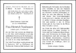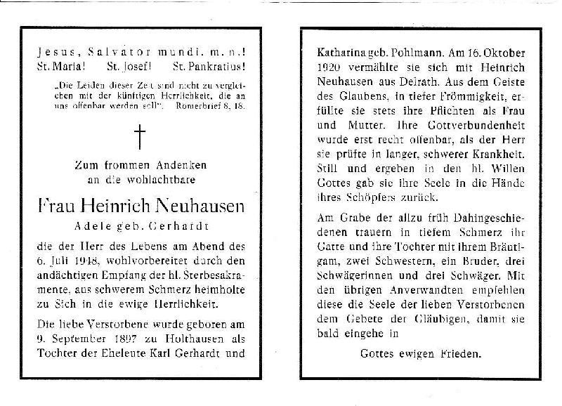 Eltern: Karl Gerhardt u. Katharina geb. Pohlmann; ∞ 16.10.1920 Heinrich Neuhausen aus Delrath; lange, schwere Krankheit; 1 Tochter |