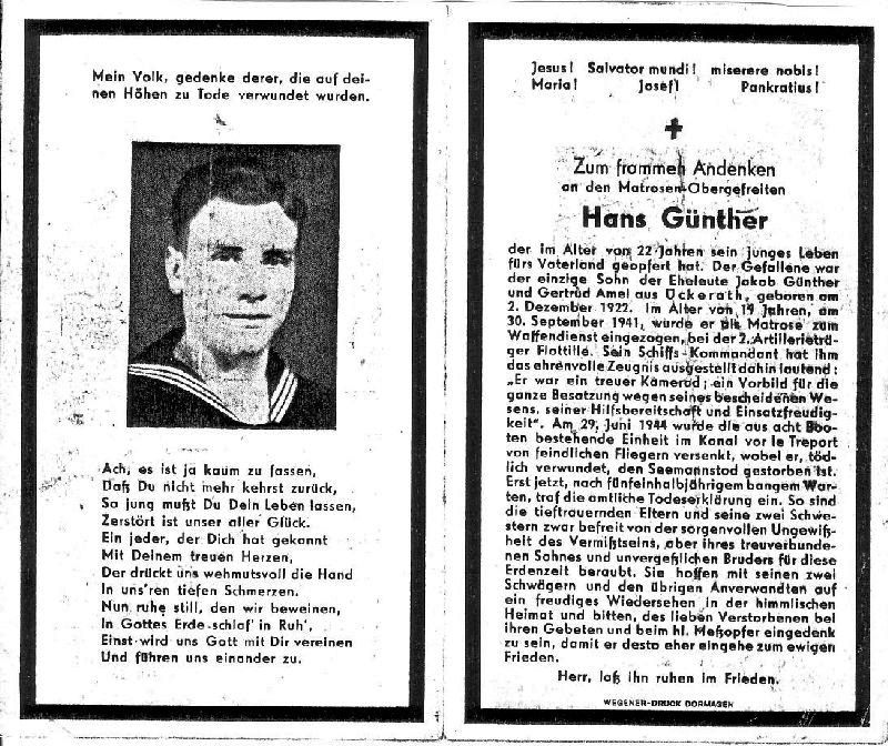 Gefallener 2. Weltkrieg; Eltern: Jakob Günther u. Gertrud geb. Amel; 1941 zur Marine eingezogen; Druck in Dormagen |