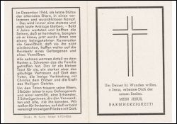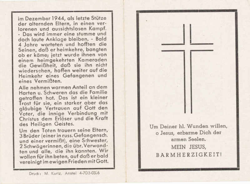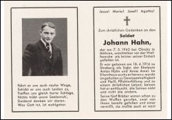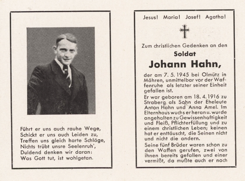 | Totenzettel-Nr.: | 34279 |  | Name: | Hahn |  | Vorname: | Johann |  | Geburtsort: | Straberg |  | Geburtsdatum: | 18.04.1916 |  | Sterbeort: | b. Olmütz/Mähren |  | Sterbedatum: | 07.05.1945 |  | Bearbeiter: | Josef Wißkirchen |  | Sammlung: | Katharina Pohl und Annegret Luca, Straberg |  | Sonstiges: |  | Gefallener 2. Weltkrieg; Eltern: Anton Hahn u. Anna geb. Amel; 2 seiner Brüder gefallen, 1 Bruder vermisst; Dez. 1944 Einberufung; Gefangenschaft; vermisst; Todesnachricht erst 4 J. später |  |