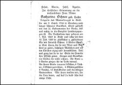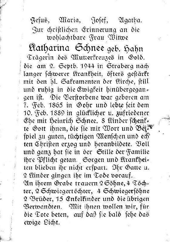 | Trägerin des Mutterkreuzes in Gold; lange, schwere Krankheit; ∞ 10.2.1889 Heinrich Schnee, † ; 8 K., davon 2 † |