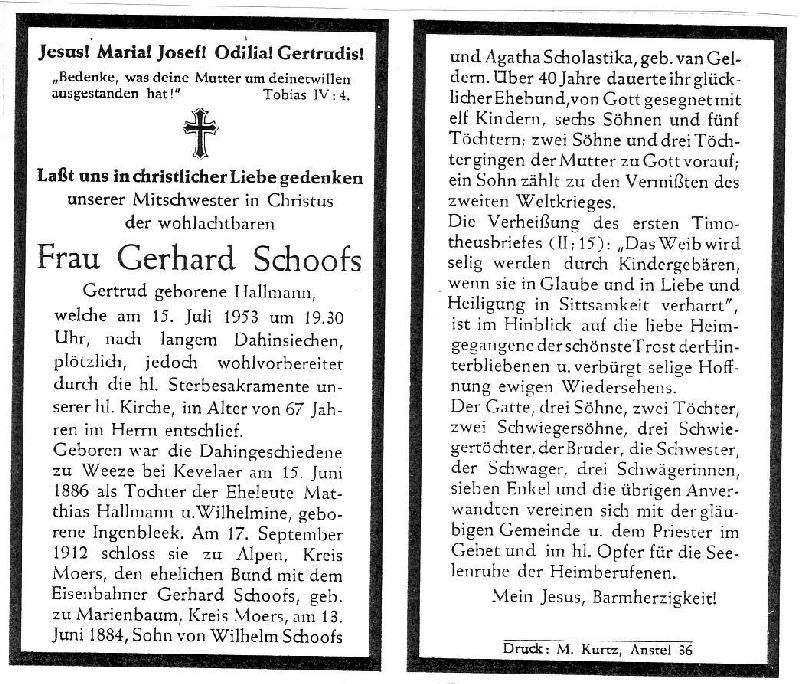 | Langes Dahinsiechen; Eltern: Matthias Hallmann u. Wilhelmine geb. Ingenbleek; ∞ 17.9.1912 in Alpen, Krs. Moers, Eisenbahner Gerhard Sch∞fs, geb. 13.6.1884 in Marienbaum, Krs. Moers, als Sohn von Wilhelm Sch∞fs u. Agatha Scholastika geb. van Geldern; 11 K., davon 5 ††, 1 Sohn im 2. Weltkrieg vermisst; Druck in Anstel |