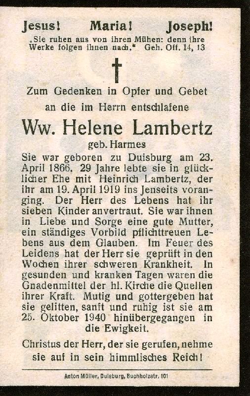 ∞ 1890 Heinrich Lambertz, † 19.4.1919; 7 K.; Druck in Duisburg |