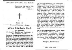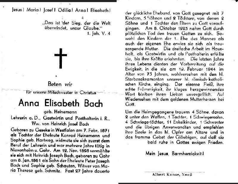| Eltern: Konrad Heinemann u. Sophie geb. Hartweg; Lehrerin; mehrere Jahre in Nievenheim tätig; ∞ 12.11.1898 Heinrich Joseph Bach, †8.10.1925, *8.1.1861 in Gohr als Sohn von Peter Joseph Bach u. Sohie geb. Schauten, Witwer von Maria Therese geb. Schmitz; 7 K., davon 3 † ; Gastwirtin und Posthalterin; Druck in Neuss |