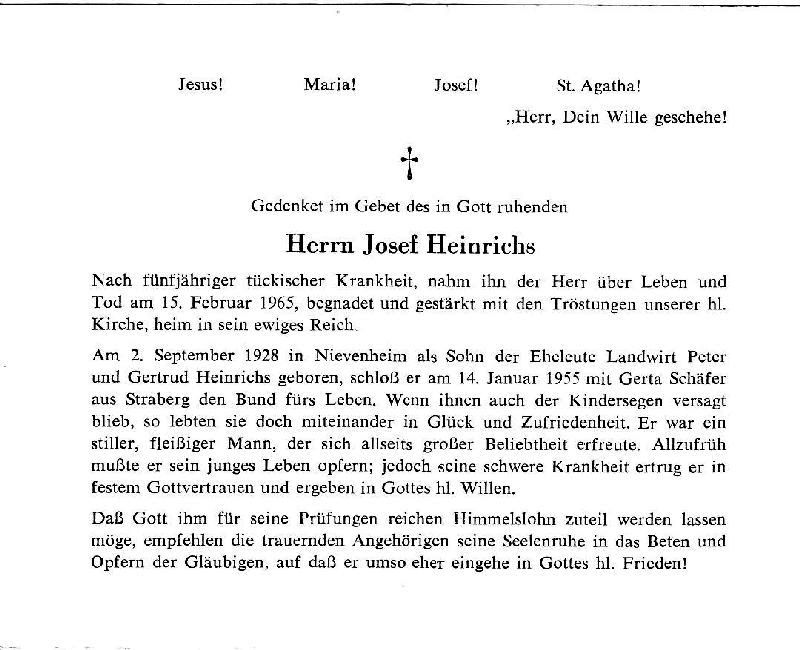 | 5-jährige Krankheit; Eltern: Ehel. Landwirt Peter u. Gertrud Heinrichs; ∞ 14.1.1955 Gerta Schäfer aus Traberg; kinderlos |