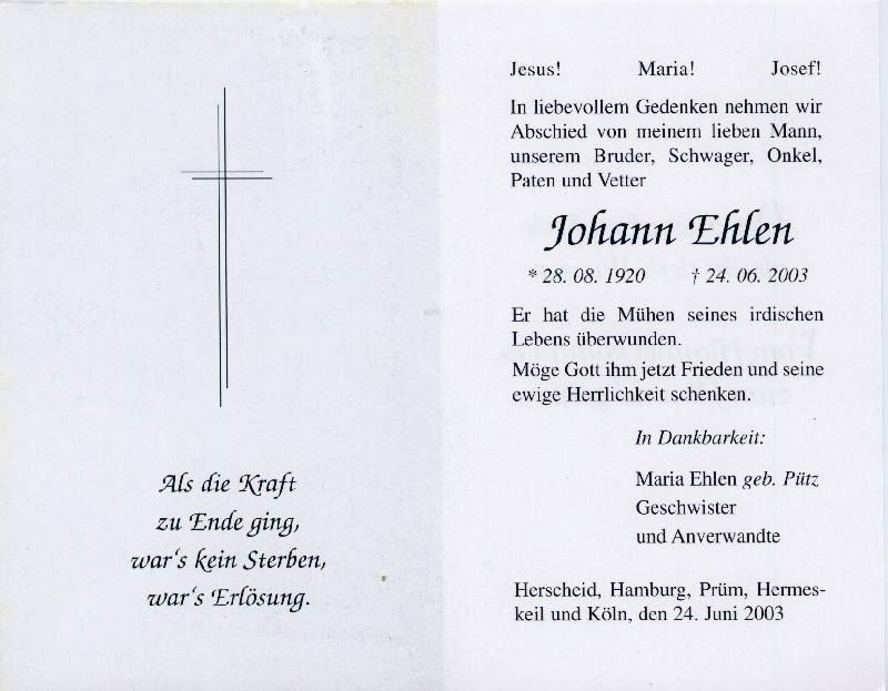 ∞ Maria Pütz; Familienangehörige in: Herscheid, Hamburg, Prüm, Hermeskeil, Köln |