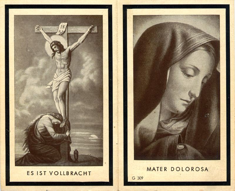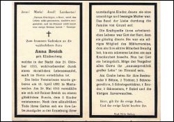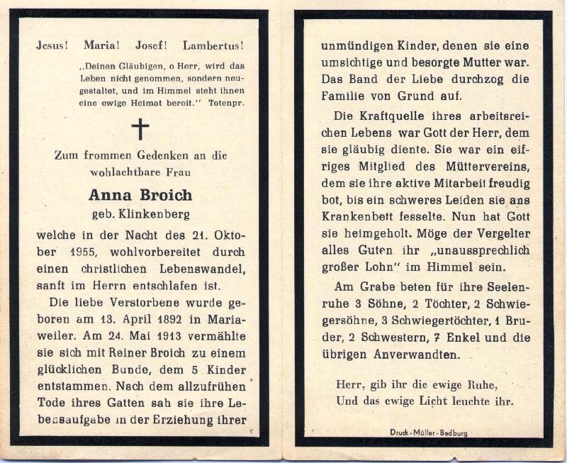 ∞ 24.5.1913 Reiner Broich, früh † ; 5 K.; Mitgl. Mütterverein; schweres Leiden fesselte sie ans Krankenbett; Druck in Bedburg/Erft |