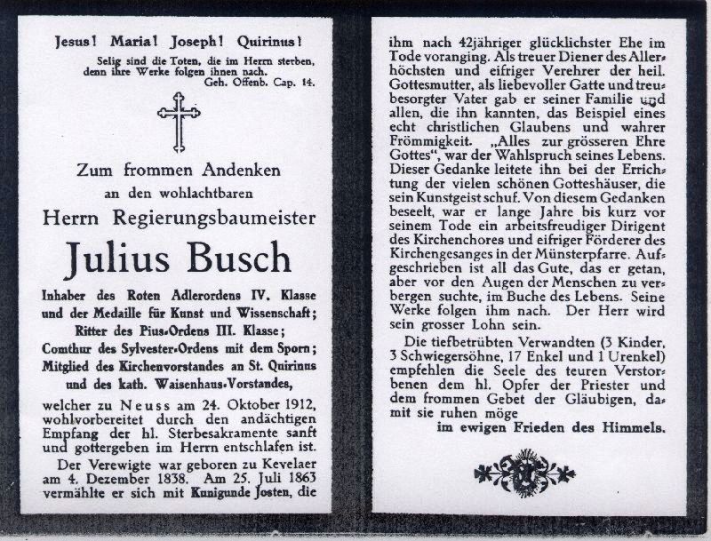 ∞ 25.7.1863 Kunigunde Josten, † ca. 1905; 3 K.; Regierungsbaumeister; zahlreiche Kirchbauten: Bergheim (St. Remigius), Bedburg (St. Lambertus), Königshoven; Synagoge Geldern; Roter Adlerorden IV. Kl.; Mitgl. Kirchenvorstand St. Quirinus Neuss und des kath. Waisenhaus-Vorstandes |
