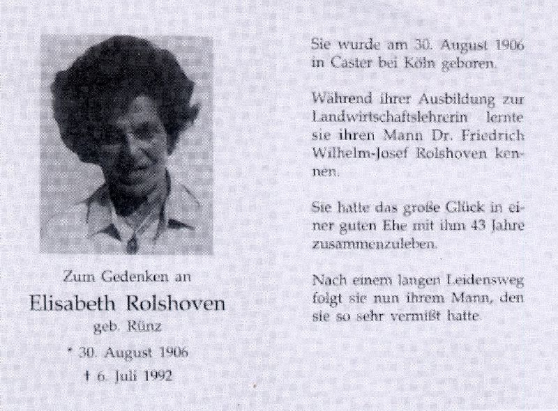 | Ausbildung zur Landwirtschaftslehrerin; ∞ Dr. Friedrich Wilhelm-Josef Rolshoven, † nach 43 J. Ehe |