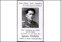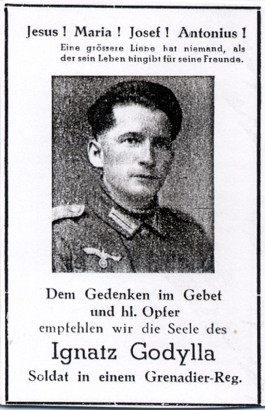 | Gefallener 2. Weltkrieg; Eltern: Josef Godylla, † vor 4 J., u. Agnes geb. Lesna, † vor 13 J.; kam früh mit seinen Eltern in die Pfarrei Bedburg; erlernte in Buchholz das Bäckerhandwerk; Febr. 1942 Einberufung; mehrmals schwer erkrankt; Mai 1943 erneut nach Russland |