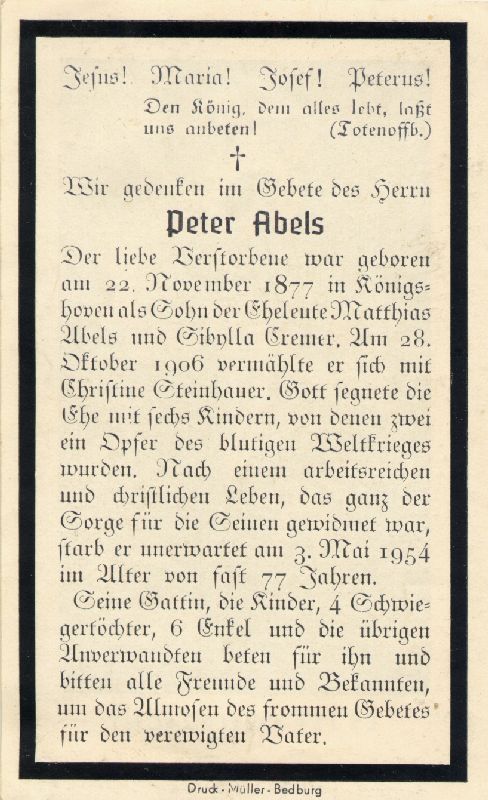 Eltern: Matthias Abels u. Sibylla geb. Cremer; ∞ 28.10.1906 Christine Steinhauer; 6 K., davon wurden 2 Opfer des 2. Weltkrieges |