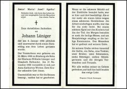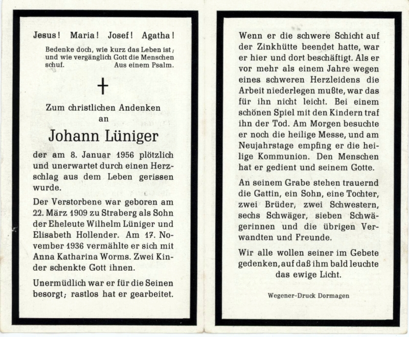 | Herzschlag; Eltern: Wilhelm Lüniger u. Elisabeth geb. Hollender; ∞ 17.11.1936 Anna Katharina Worms; 2 K.; arbeitete auf der Zinkhütte; seit über einem Jahr herzleidend; Druck in Dormagen |