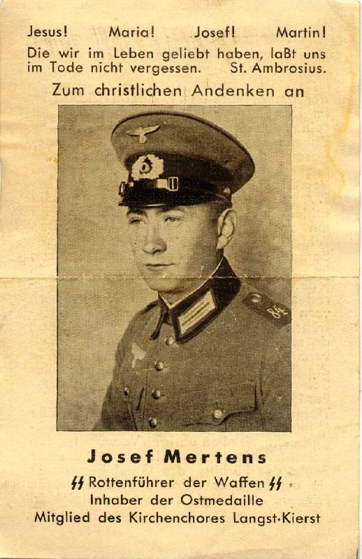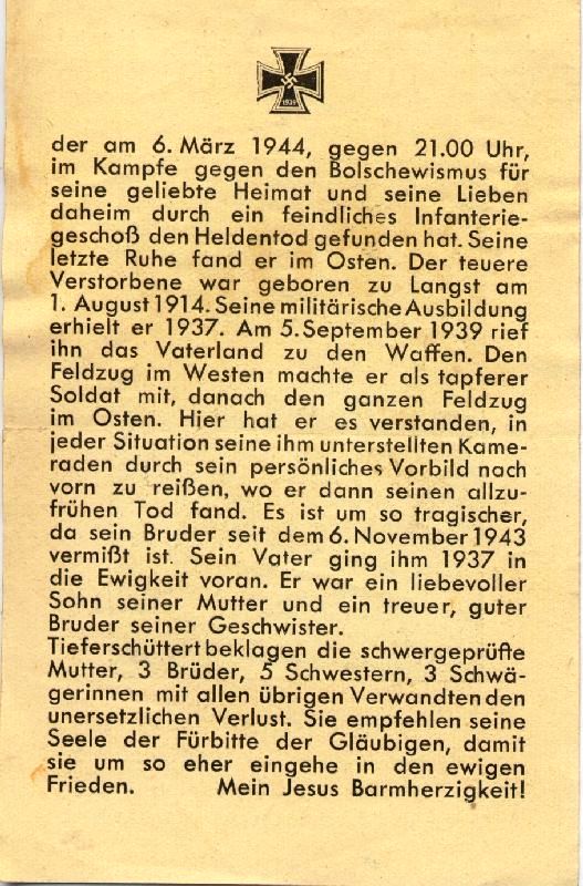 Gefallener 2. Weltkrieg; Rottenführer der Waffen-SS; Mitgl. Kirchenchor Langst-Kierst; 5.9.1939 Einberufung; sein Bruder seit dem 6.11.1943 vermisst; Vater † 1937; |