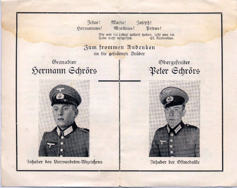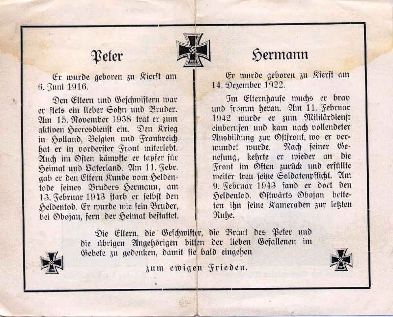 Gefallener 2. Weltkrieg; 2 Tage vor seinem Tod erfuhr er vom Tod seines Bruders Hermann; Beisetzung östl. Obojan; seit 15.11.19138 im Heeresdienst; Einsatz in Holland, Belgien, Frankreich, dann Osten; verlobt |