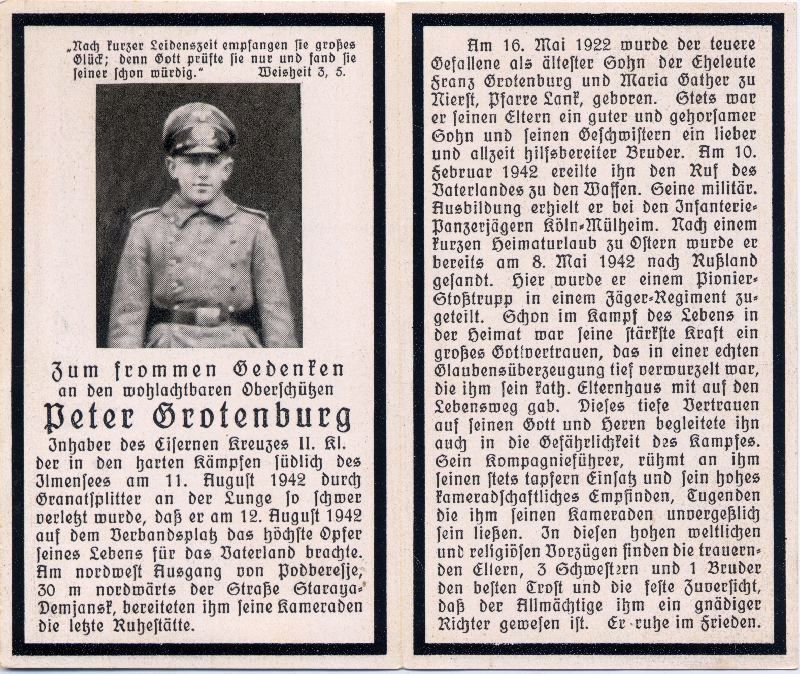 Gefallener 2. Weltkrieg; am 11.8.1942 schwer verletzt; Beisetzung nordw. von Podberesje, 30 m nördl. der straße Staraya-Demjansk; Eltern: Franz Grotenburg u. Maria geb. Gather; 10.2.1942 Einberufung; 8.5.1942 nach Russland |