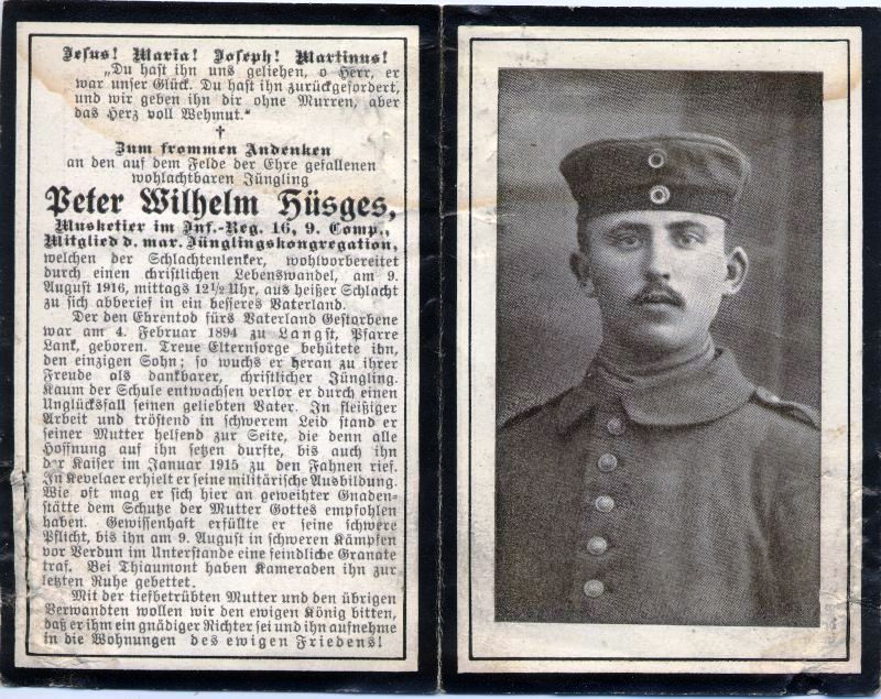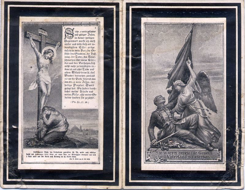Gefallener 1. Weltkrieg; verlor durch Unglücksfall früh seinen Vater; Januar 1915 Einberufung; Grtab b. Thiaumont |