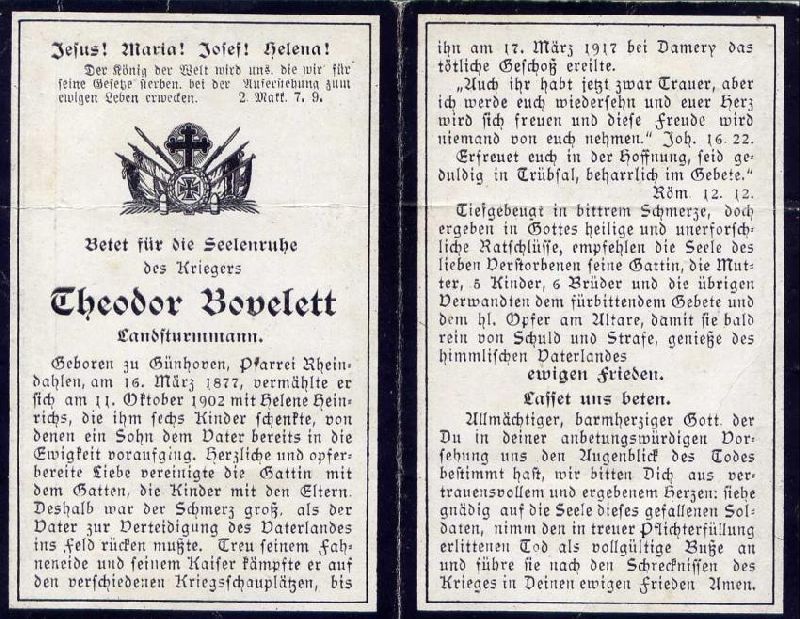 Gefallener 1. Weltkrieg; ∞ 11.10.1902 Helene Heinrichs; 6 K., davon 1 Sohn †; |