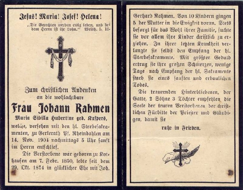 ∞ 29.10.1874 Johann Gerhard Rahmen; 10 K., davon 5 †; |