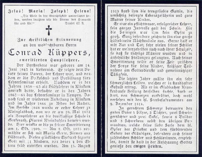 1858-63 Hilfslehrer in Klinkum; 1863-65 Lehrerseminar Kempen; anschließend wieder Lehrer in Klinkum, 1868 in Afden b. Aachen; 1868 1. Lehrer in Kleingladbach, 29.5.1872 Hauptlehrer in Gerkerath, Pfarrei Rheindahlen; Emeritierung 1.10.1909; ∞ 7.10.1875 Maria Gertrud Siemes aus Hilderath, †† 15.8.1910; 11 K., davon 4 †; in den letzten Jahren leidend |