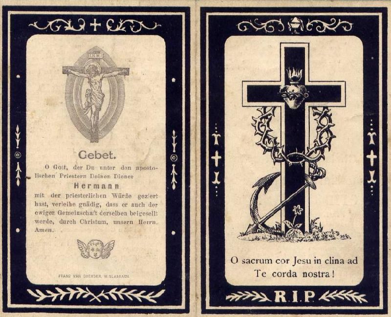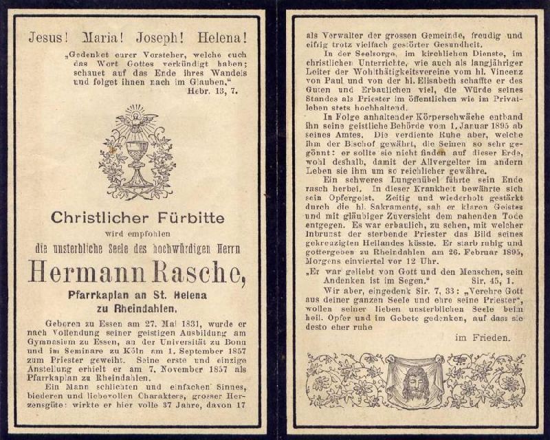 Priesterweihe Köln 1.9.1857; erste u. einzige Anstellung als Pfarrkaplan zu Rheindahlen 7.11.1857; wirkte hier 37 J., davon 11 J. als Verwalter der großen Gemeinde; wegen anhaltender Körperschwäche am 1.1.1895 seines Amtes entbunden; schweres Lungenübel |
