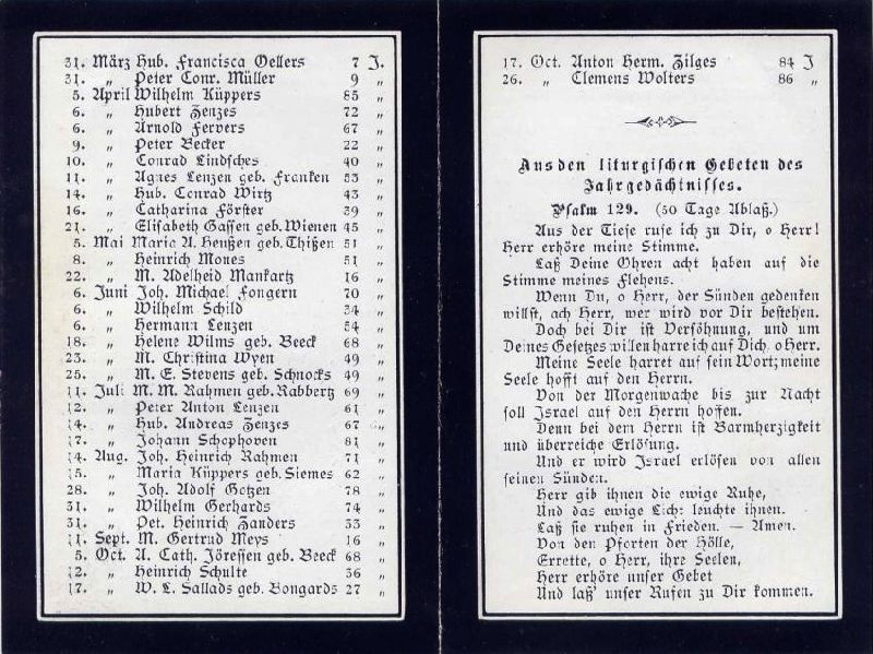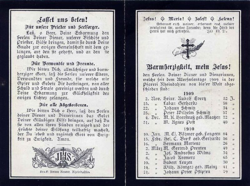 | Pfarrgemeinde Rheindahlen: gemeinsamer Totenzettel für alle zwischen dem 2.11.1909 und 26.10.1910 verstorbenen Pfarrmitglieder |