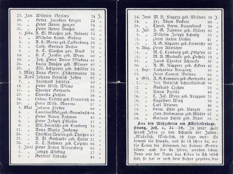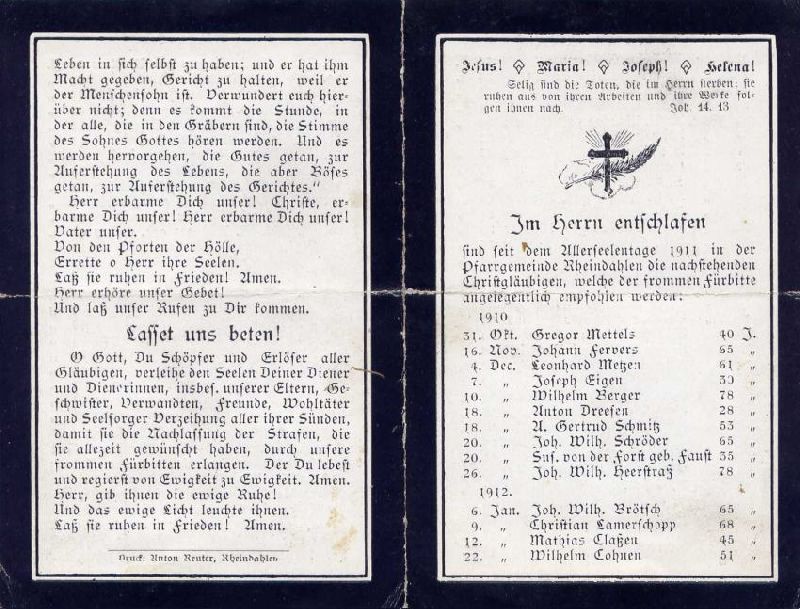 | Pfarrgemeinde Rheindahlen: gemeinsamer Totenzettel für alle zwischen dem 31.10.1911 und 24.10.1912 verstorbenen Pfarrmitglieder |