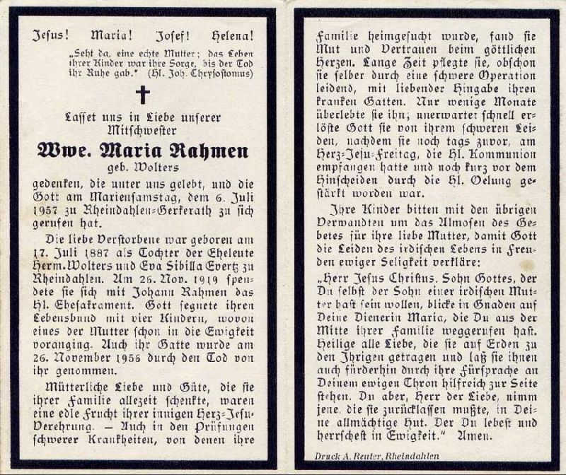 | Eltern: Hermann Wolters u. Eva Sibilla geb. Evertz; ∞ 26.11.1919 Johann Rahmen, † 26.11.1956; 4 K., davon 1 †; pflegte lange ihren kranken Gatten |