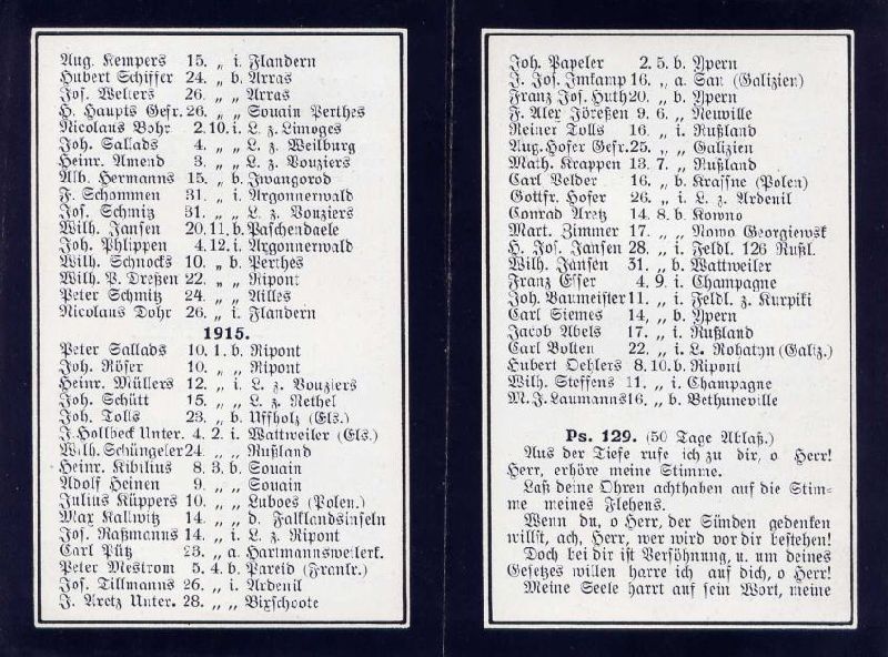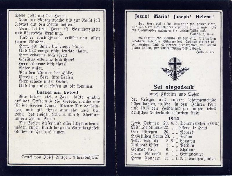 | Gefallener 1. Weltkrieg; Pfarrgemeinde Rheindahlen: gemeinsamer Totenzettel für alle Gefallenen der Jahre 1914 und 1915 |