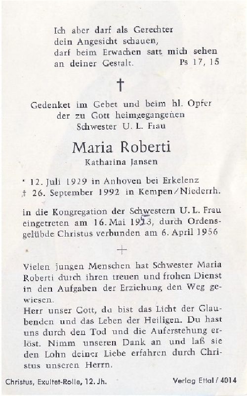 Maria Roberti, Sr., geb. Jansen | Vorname: |