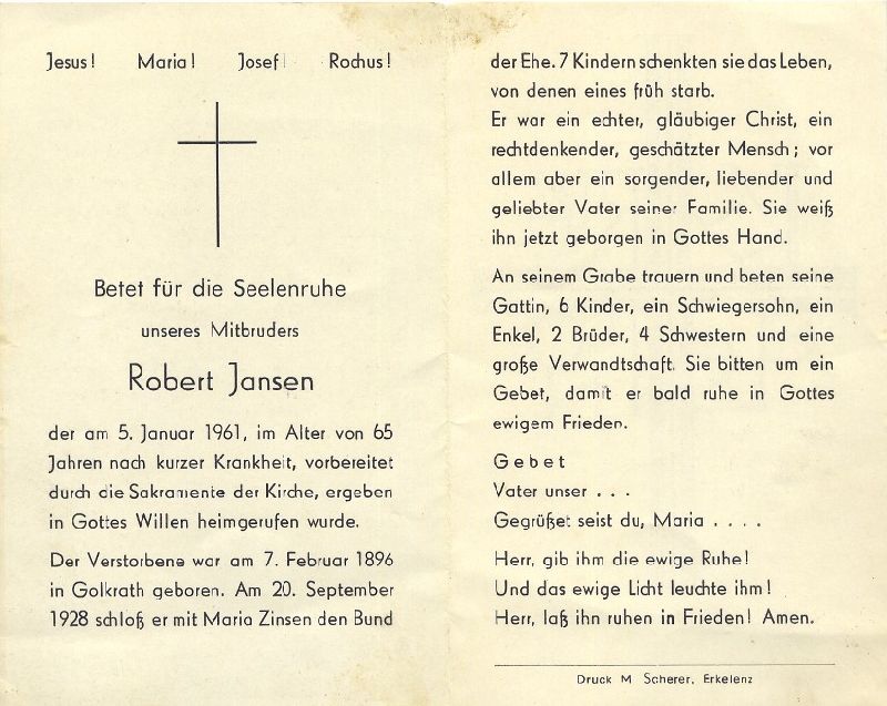 ∞ 20.9.1928 Maria Zinsen; 7 K., davon 1 früh †; Druck in Erkelenz |