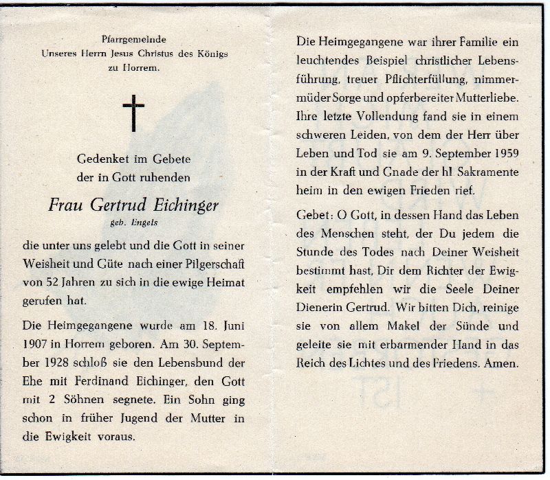 ∞ 30.9.1928 Ferdinand Eichinger; 2 Söhne, davon 1 in früher Jugend †; schweres Leiden |